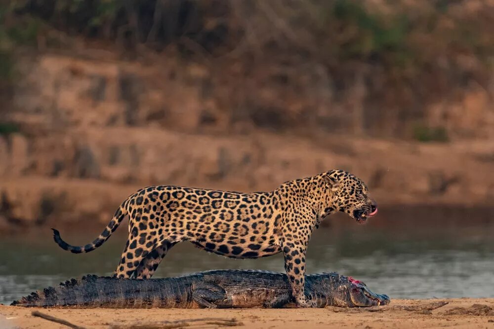 Uma das menores onças fêmeas monitoradas no Parque Nacional Encontro das Águas, em Porto Jofre, na divisa dos municípios de Poconé e Barão de Melgaço, foi flagrada caçando um jacaré maior do que ela para alimentar os filhos durante o pôr do sol no Pantanal Mato-grossense.