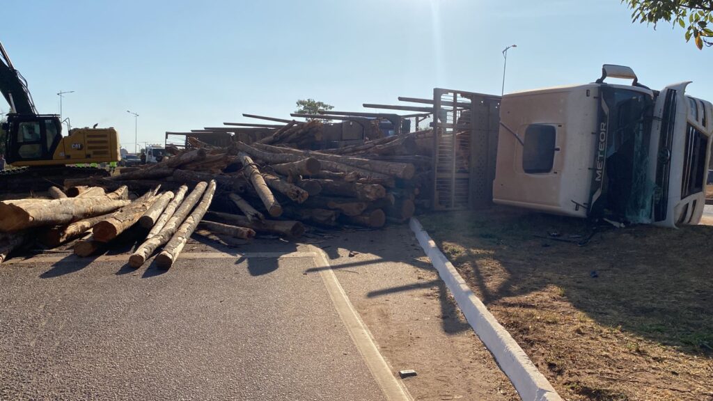 Uma carreta carregada com toras tombou, nesta manhã (19), na BR-163 em Sinop, próximo ao São Cristóvão. O motorista ficou ferido e foi resgatado ao Hospital Regional.