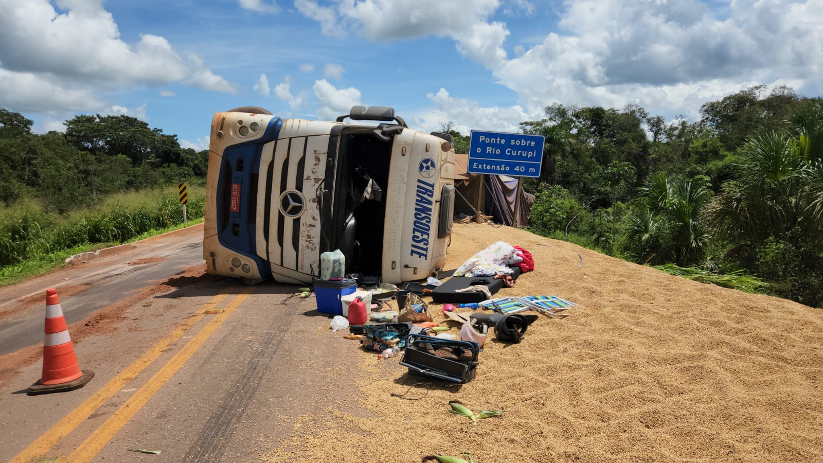 Uma carreta carregada com grãos de soja tombou na MT-220, na manhã desta quarta-feira (12), após o pneu estourar na ponte do Rio Curupi, próximo a Sinop. O motorista foi socorrido com ferimentos ao Hospital Regional.