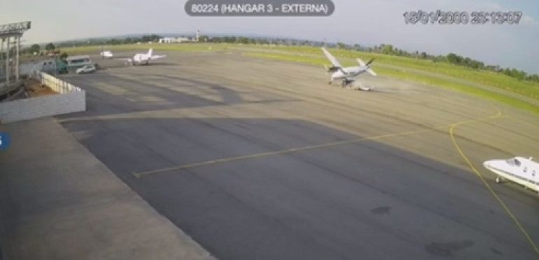 Imagens das câmeras de segurança mostram o momento em que a aeronave aparece já em queda e tentando pousar de volta na pista, quando perde o controle e avança em direção às obras de um terminal de passageiros no local, ao lado do hangar. Poucos segundos depois acontece a explosão.