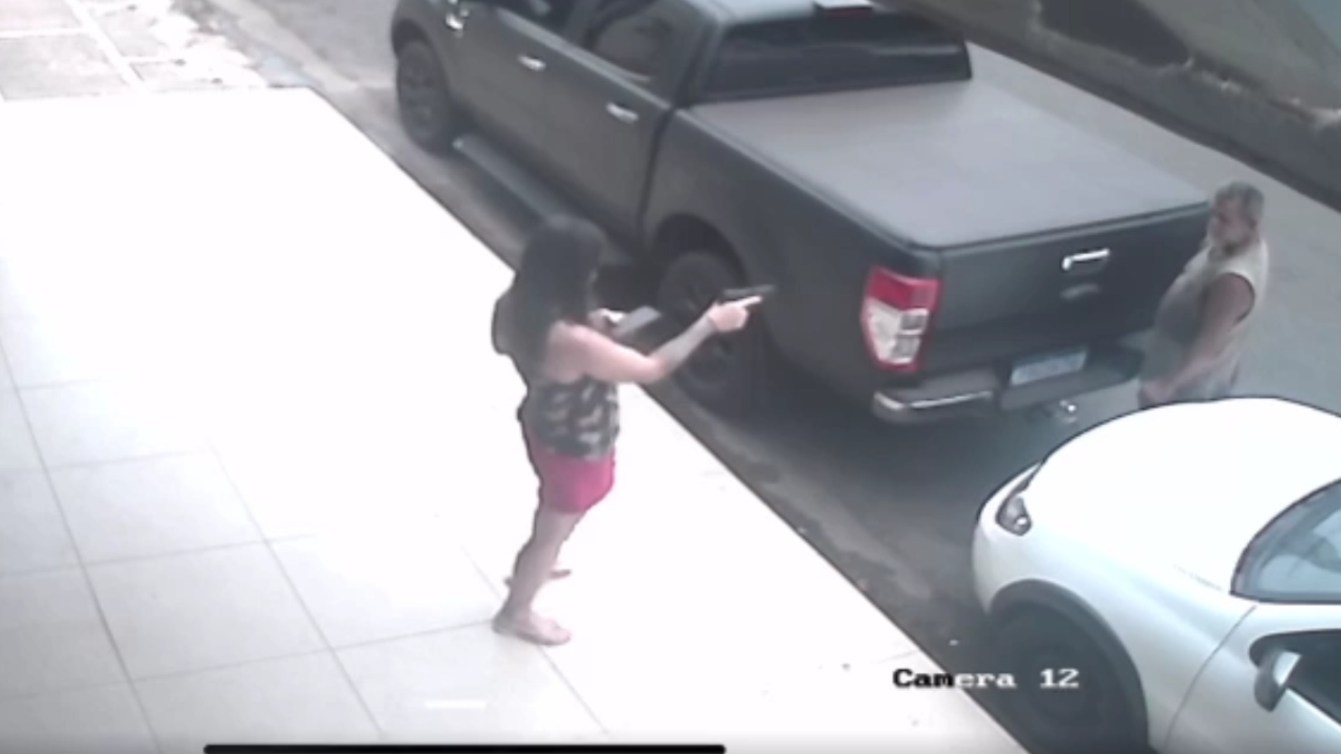 Nas imagens é possível ver quando o homem tenta abrir a tampa da carroceria de uma caminhonete, momento em que a delegada aparece e gesticula para ele se afastar do veículo. Em seguida, ele entra em luta corporal com a delegada que está com a arma em punho. Os dois caem no chão.