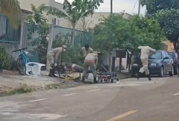 Conforme relatos do Corpo de Bombeiros, a equipe foi acionada por populares após um morador ser atacado e cair em frente à sua residência. Imagens registraram o homem no chão enquanto um enxame de abelhas circulava sobre ele.