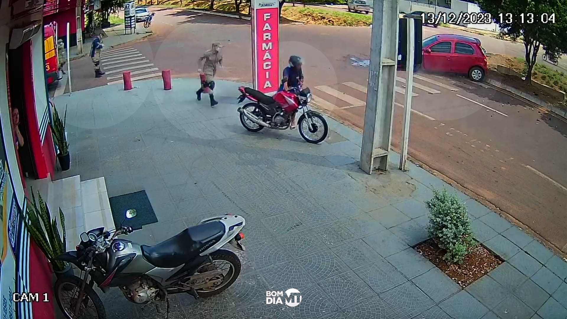 No primeiro acidente, uma mulher e uma criança, em uma motocicleta, foram atingidas por um motociclista. O vídeo mostra o momento em que tentavam fazer a conversão e foram atingidas por trás. Elas foram socorridas e receberam cuidados médicos.