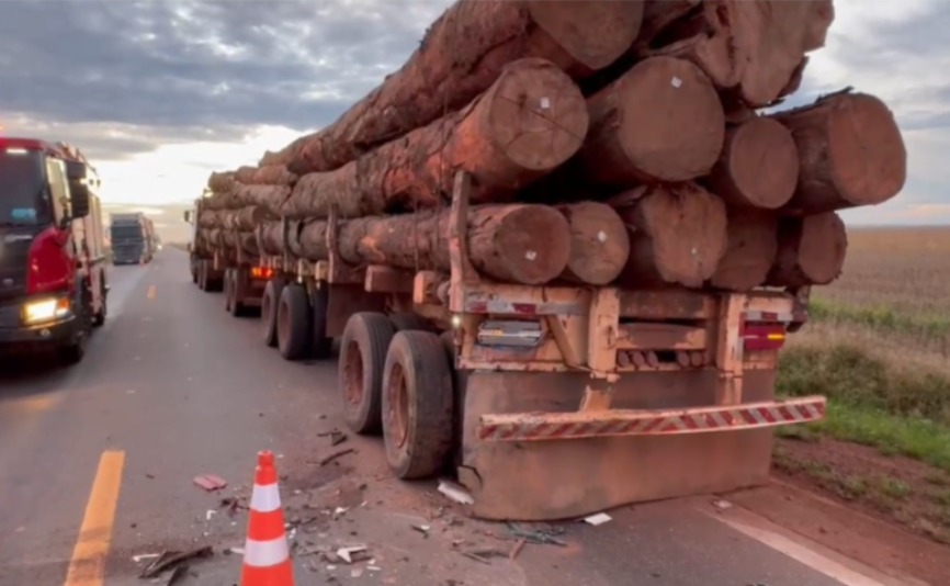 Uma pessoa morreu e outra ficou ferida na madrugada desta quinta-feira (20) após um carro colidir com uma carreta carregada com toras na rodovia MT-220.