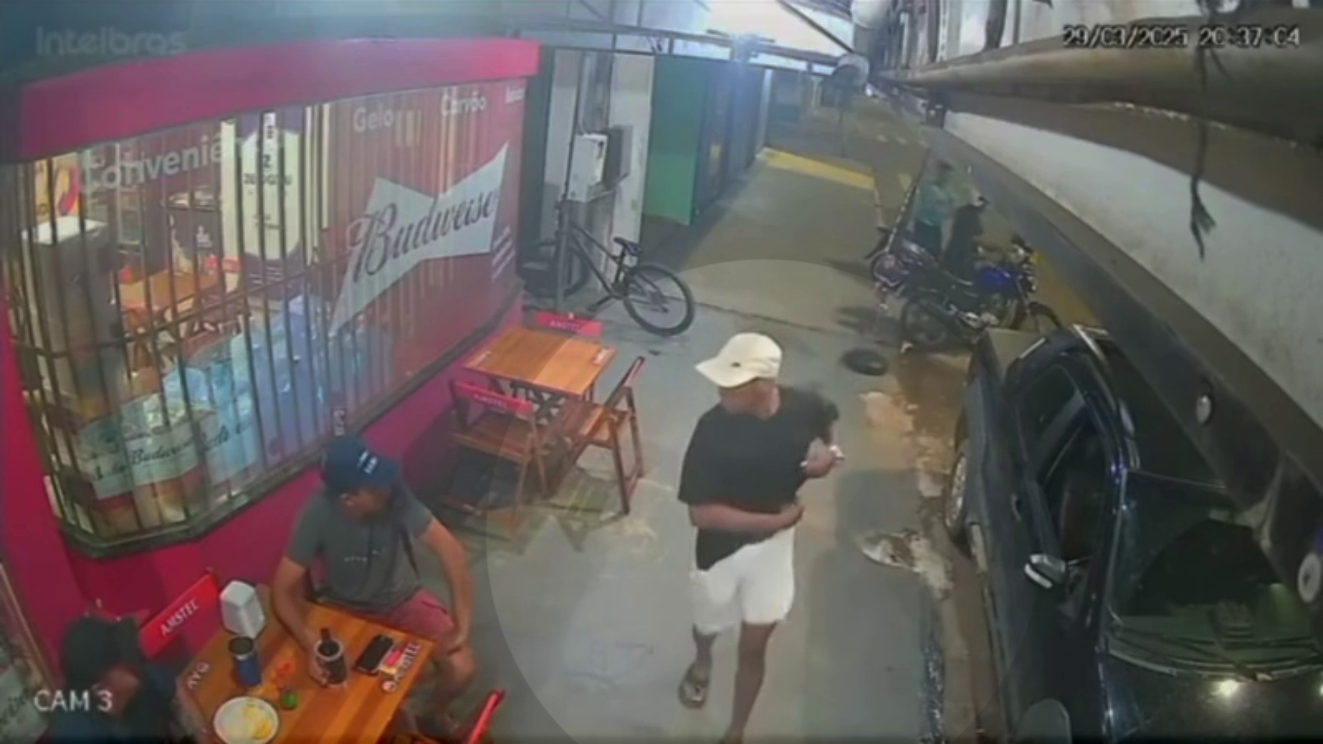 Imagens de segurança mostram o momento em que o agressor chega a pé, tira uma faca da cintura e parte para cima da vítima. Durante a agressão, um homem tenta intervir e atira uma cadeira contra o suspeito, que foge correndo. Já a vítima, mesmo ferida, se levanta tentando estancar o sangramento.