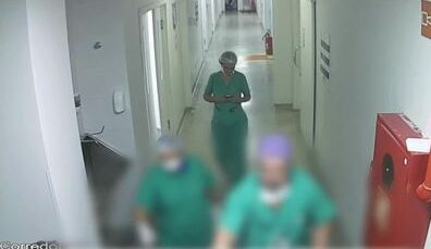 Médica com o celular da vítima no hospital, após o crime