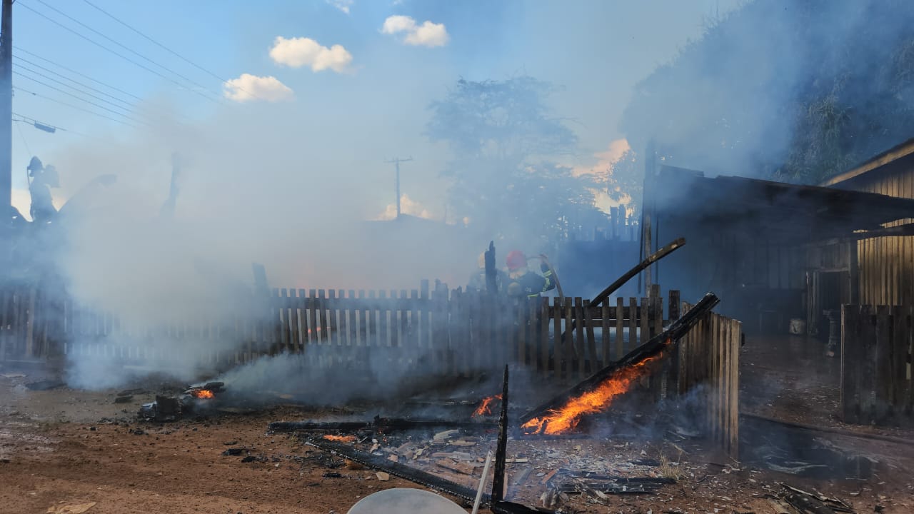 Uma casa de madeira ficou destruída pelo fogo na tarde desta sexta-feira (31), no bairro Setor Industrial, em Sinop.
