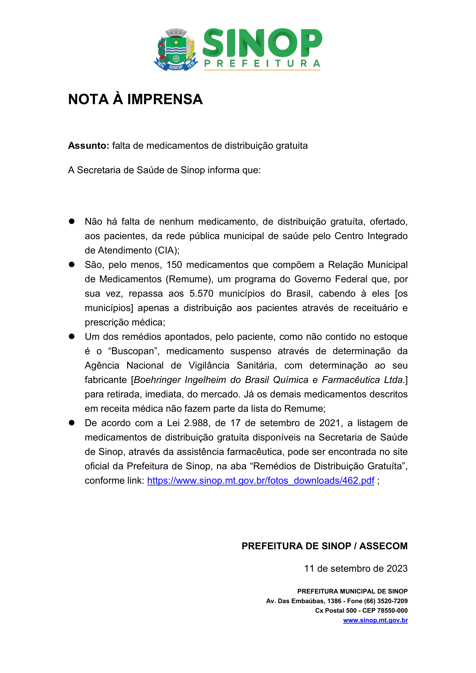 A Prefeitura de Sinop emitiu um novo comunicado nesta quinta-feira (21) informando que um dos medicamentos apontados pela paciente, como não contido no estoque, pode ser substituído por um simular, com o mesmo princípio ativo.