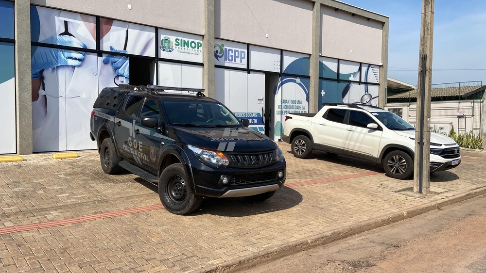 viatura e veículo descaracterizado no escritório de administração da UPA e unidades de básicas de saúde em Sinop – foto: Bom Dia MT