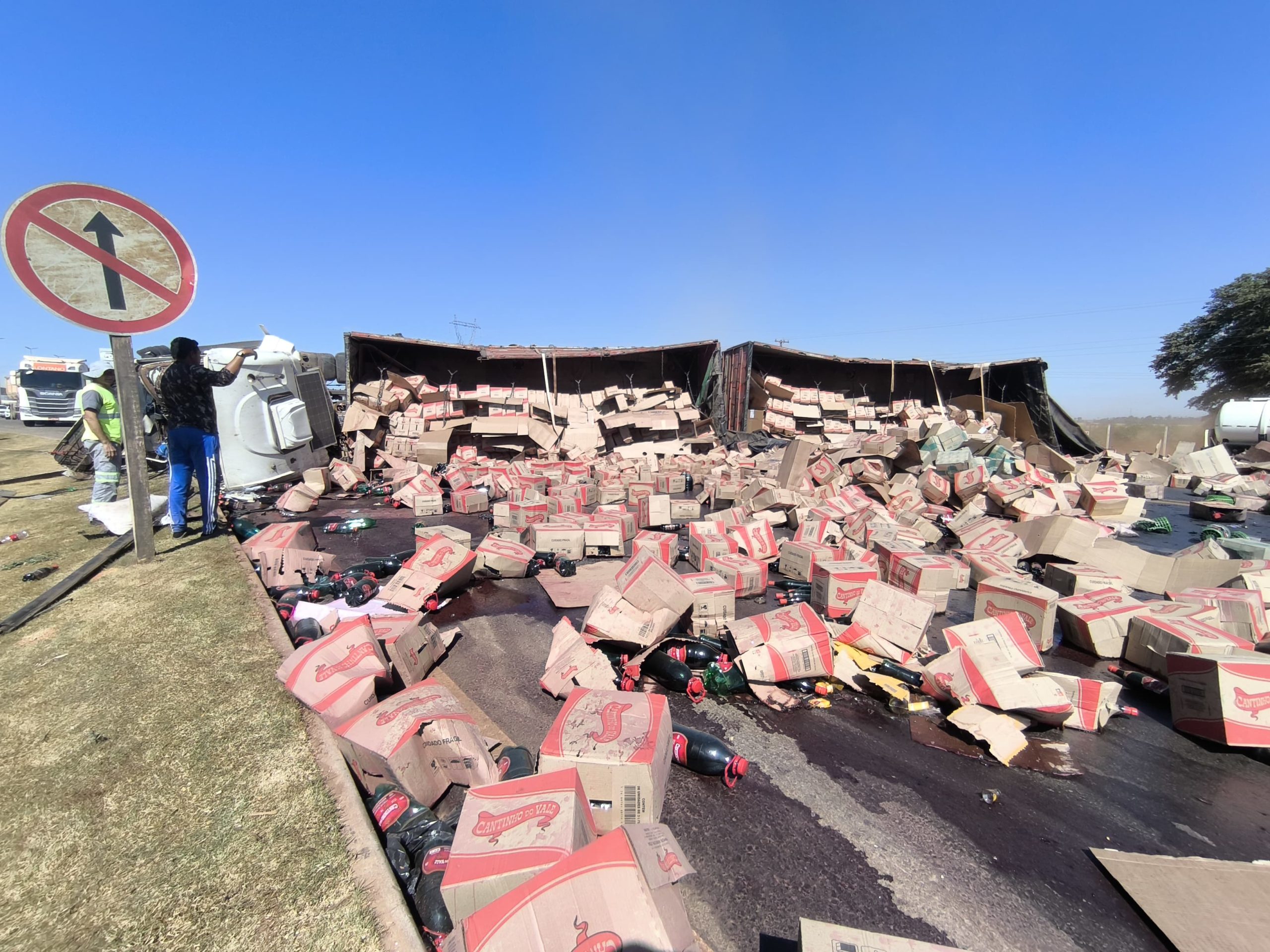 Uma carreta carregada de vinho tombou na BR-163, perto da empresa Inpasa, em Sinop, na manhã deste domingo (23). O acidente aconteceu após uma colisão com um automóvel que tentava sair da rodovia para entrar em um posto de combustível. A carga de vinho em garrafas plásticas se espalhou pela pista, que ficou interditada.