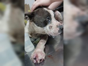 Voluntárias da Associação Projeto Melhor Amigo de Sinop (Apromas) resgataram um cachorro da raça Pitbull em Sinop, encontrado em condições precárias. O animal estava amarrado